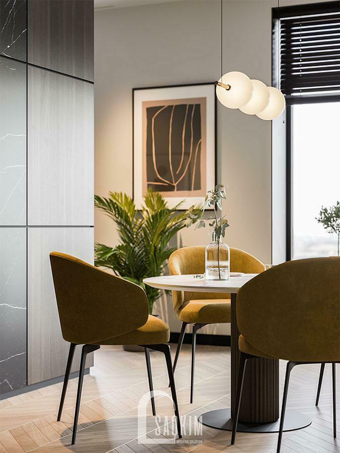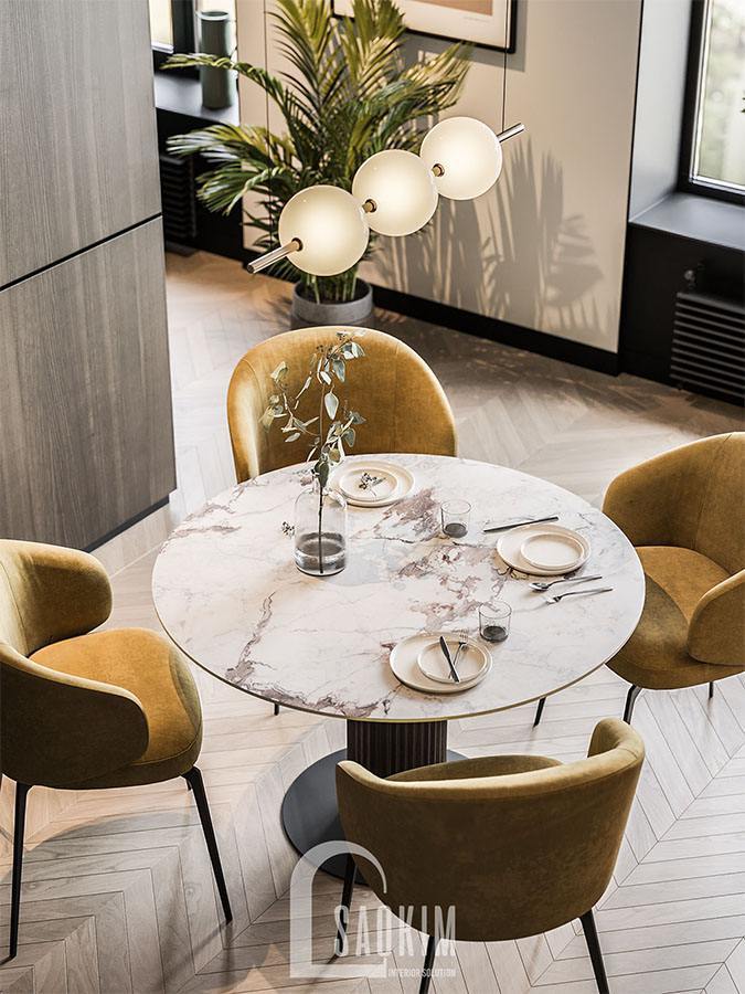 Không gian phòng ăn được thiết kế mang những đường nét hiện đại và tinh tế. Chiếc bàn ăn lớn hình tròn với mặt bàn đá cao cấp, sang trọng được đặt giữa phòng.