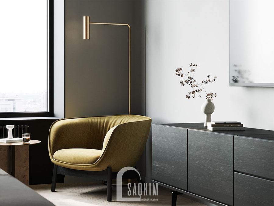 Cuối giường là bộ bàn trà giúp chủ nhân thư giãn, đọc sách và ngắm cảnh thành phố. Ghế bành thư giãn hiện đại và thanh lịch với gam màu vàng thời thượng. Kệ tivi với nhiều ngăn đa năng.