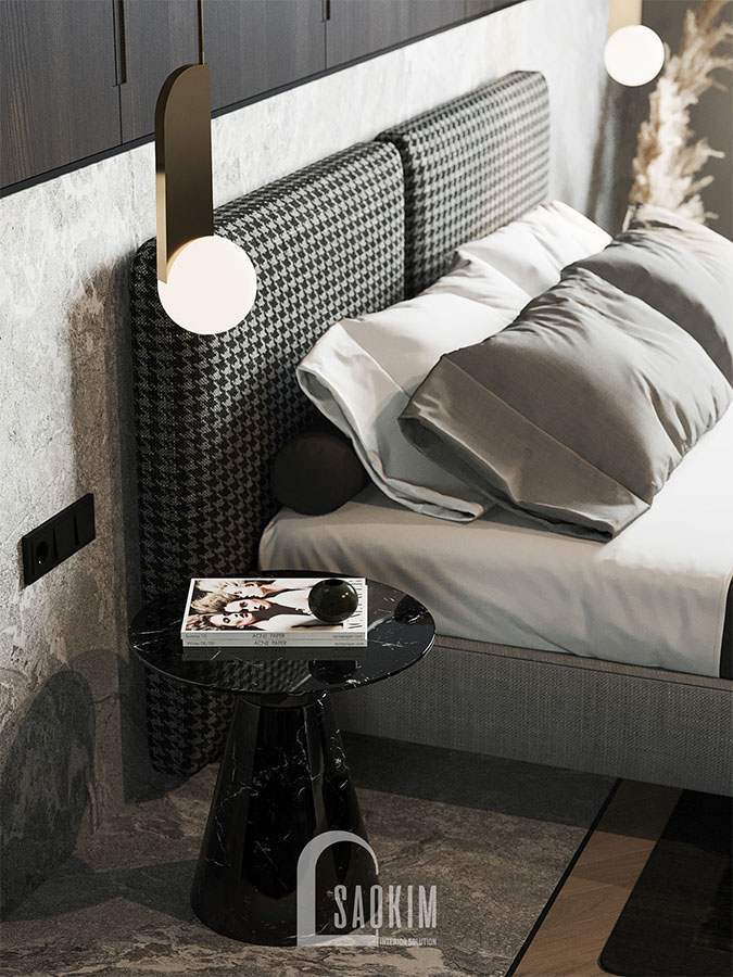 Giường ngủ được bọc nệm êm ái và đặt những chiếc gối mềm mại mang đến giấc ngủ thoải mái cho gia chủ. Thiết kế vách đầu giường kết hợp kệ đồ màu đen sang trọng chính là điểm nhấn cho phòng ngủ này. Tab đầu giường nhỏ gọn, xinh xắn với mặt tab tiện dụng.