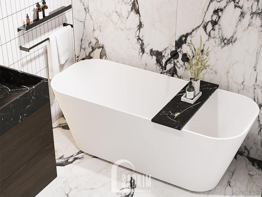 Bức tường ốp đá trắng viền đen nhằm đánh lừa thị giác, cơi nới không gian thêm rộng thoáng. Bồn rửa bằng đá vân mây đen sang trọng và kệ đồ gỗ tự nhiên nổi bật trên nền tường.