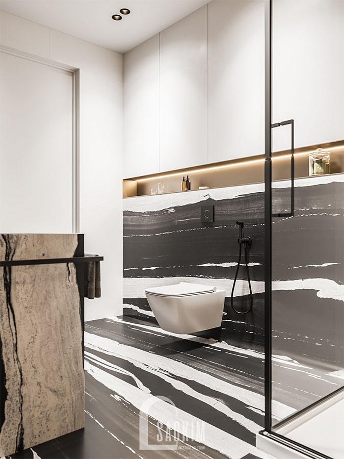 Phòng tắm toát lên vẻ đẹp sang trọng nhờ sử dụng đá ốp vân mây phối cùng màu gỗ tự nhiên. Phòng tắm đầy đủ tiện nghi với những món đồ nội thất cần thiết như: Kệ, tủ, thiết bị vệ sinh,…