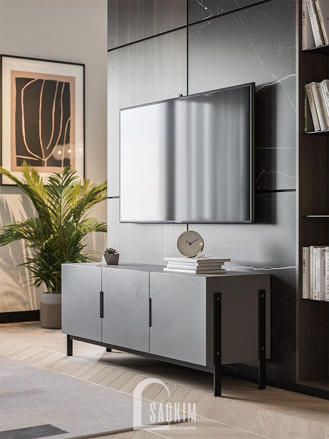 Kệ tivi với gam màu ghi sang trọng được thiết kế đơn giản, không quá cầu kỳ. Bức tường được ốp gỗ tự nhiên với các đường phào chỉ đơn giản, thanh thoát. Kệ sách bên cạnh giúp gia chủ đặt những cuốn sách mình yêu thích hay vài món đồ kỉ niệm.