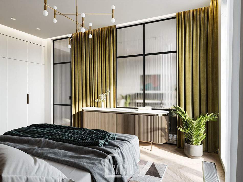 Không gian phòng ngủ trong căn hộ 1 phòng ngủ Vinhomes Symphony Riveside rộng thoáng hơn nhờ cải tạo bức tường thành cửa kính. Chiếc tủ console thiết kế sang trọng với mặt tủ bằng đá cao cấp và phần cánh bằng vách nan gỗ thời thượng. Thiết kế tủ quần áo cao kịch trần giúp gia chủ có thêm không gian cất trữ đồ đạc. Đồng thời nhằm tối ưu không gian phòng ngủ nơi đây.