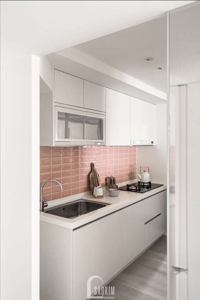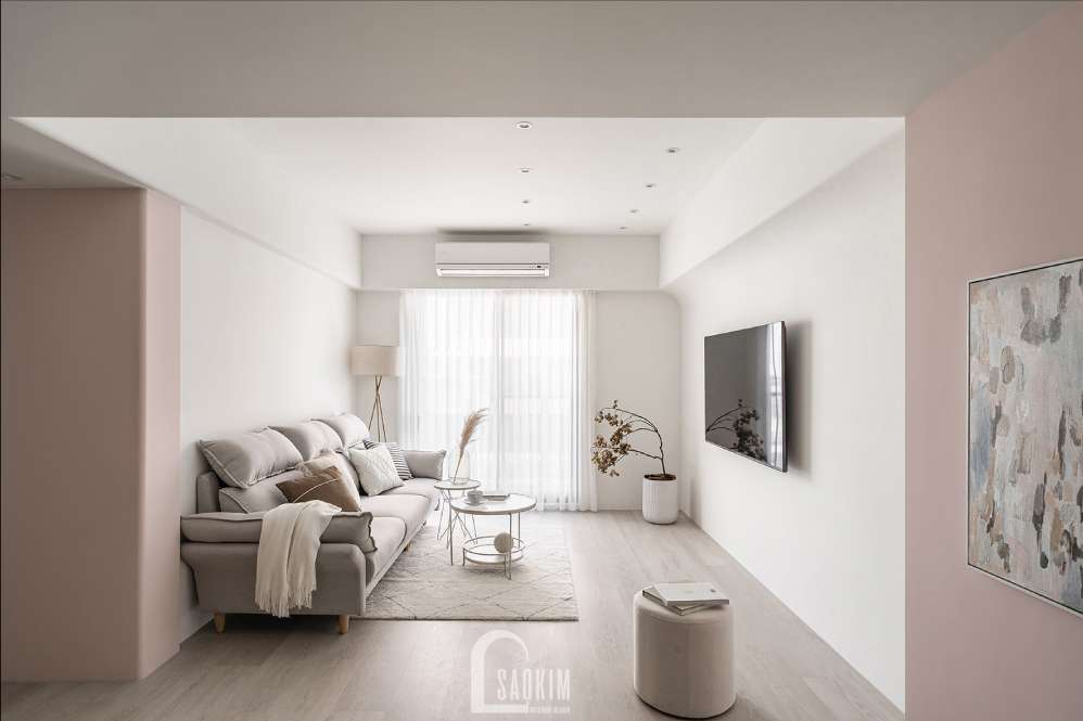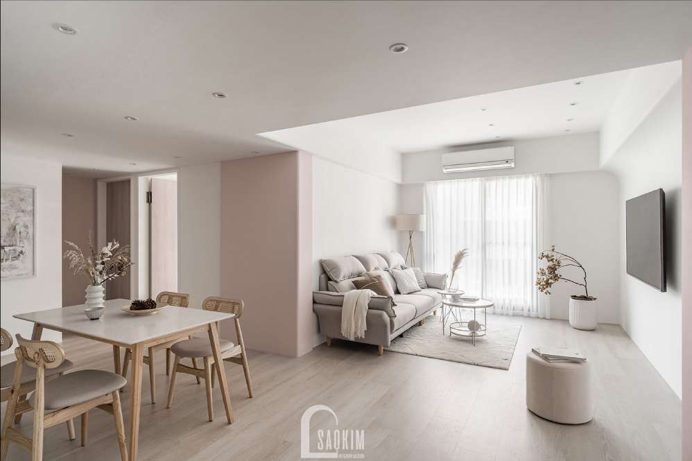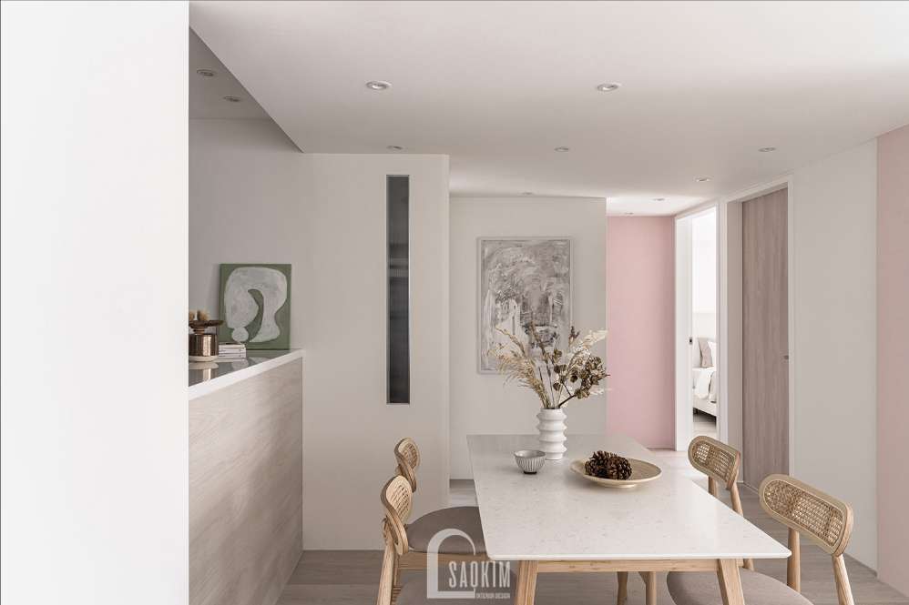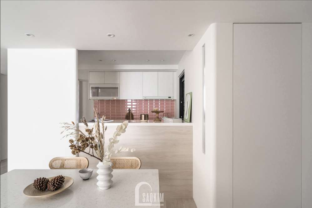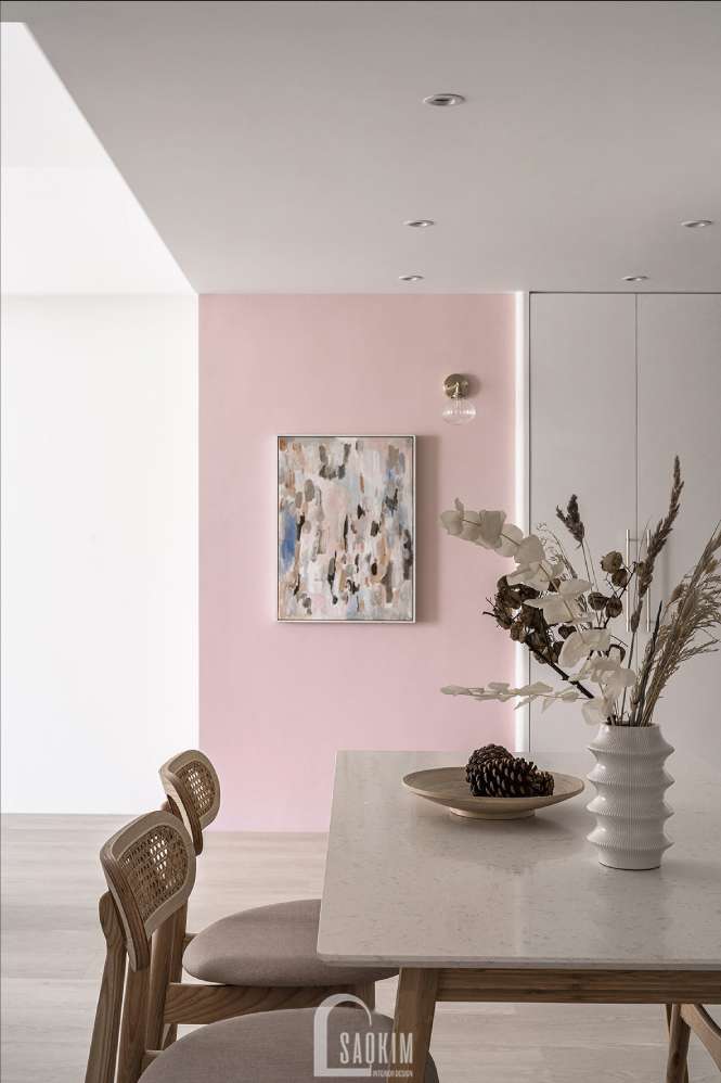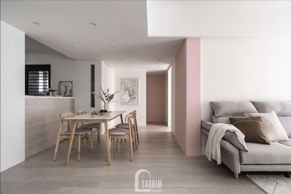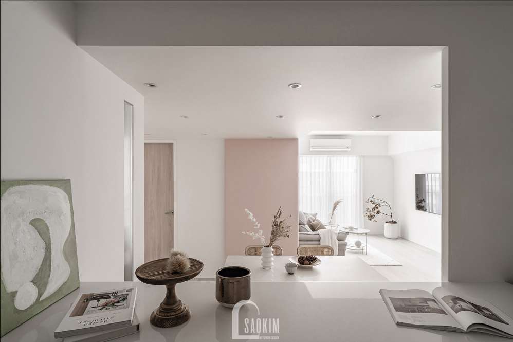 Gam màu trắng và hồng phấn không chỉ làm cho không gian trở nên tinh tế mà còn tạo điểm nhấn nữ tính và dễ thương. Để tạo nên sự cân bằng, các gam màu như nâu, ghi được sử dụng xen kẽ, tạo nên sự động lực và sự sinh động trong căn hộ.