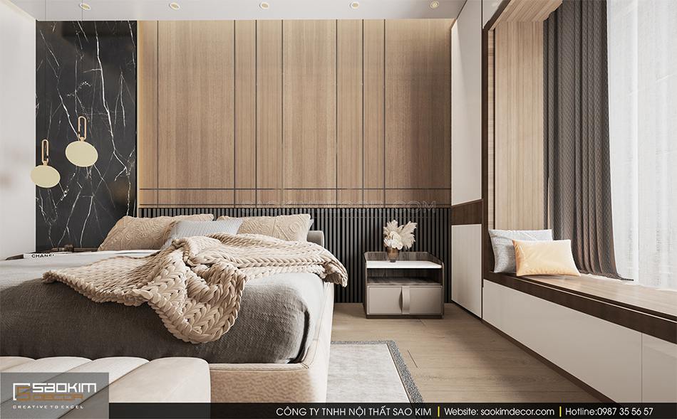 Chính phong cách hiện đại đã mang đến cho phòng ngủ này sự rộng thoáng, cảm giác thư giãn, dễ chịu. Gam gỗ, màu nâu be sử dụng tạo sự ấm cúng cho phòng ngủ. Chi tiết vách đầu giường ốp nan gỗ và tường phía đầu giường ốp gỗ màu sáng mang đến sự sang trọng, ấm áp cho phòng ngủ.