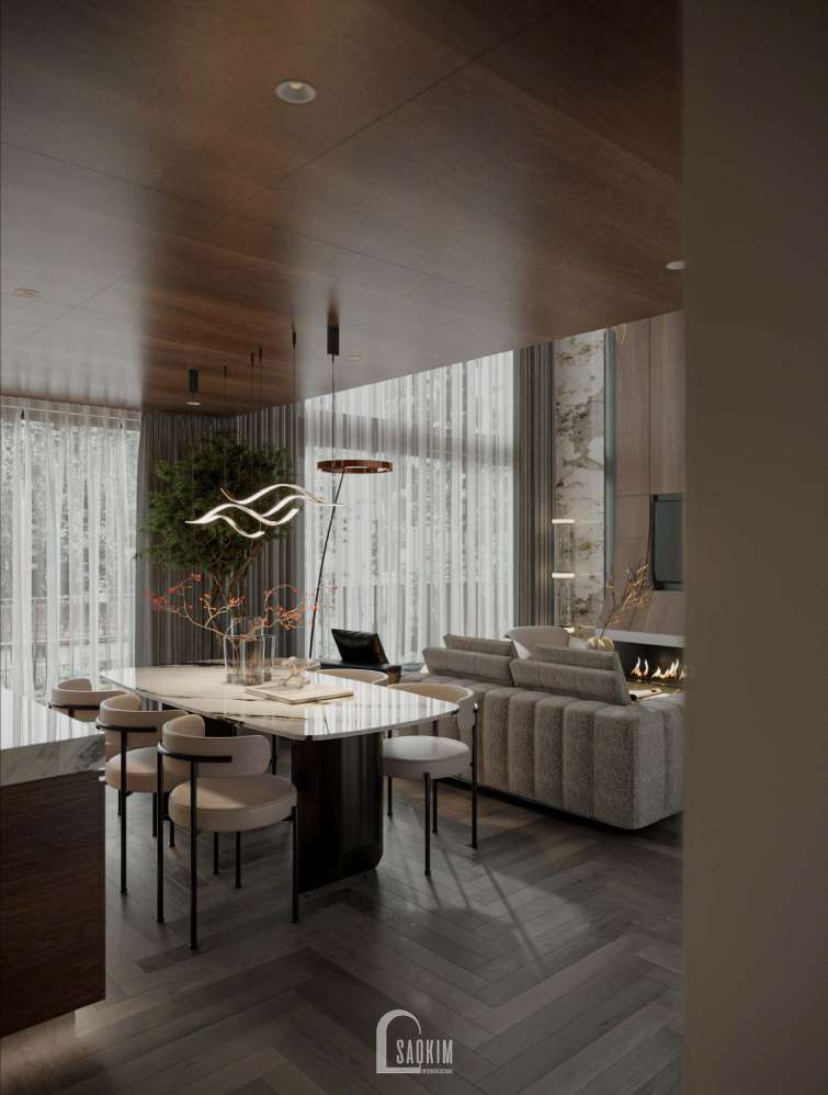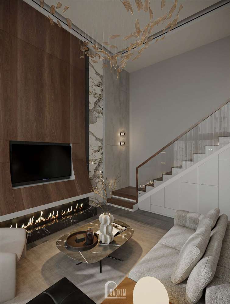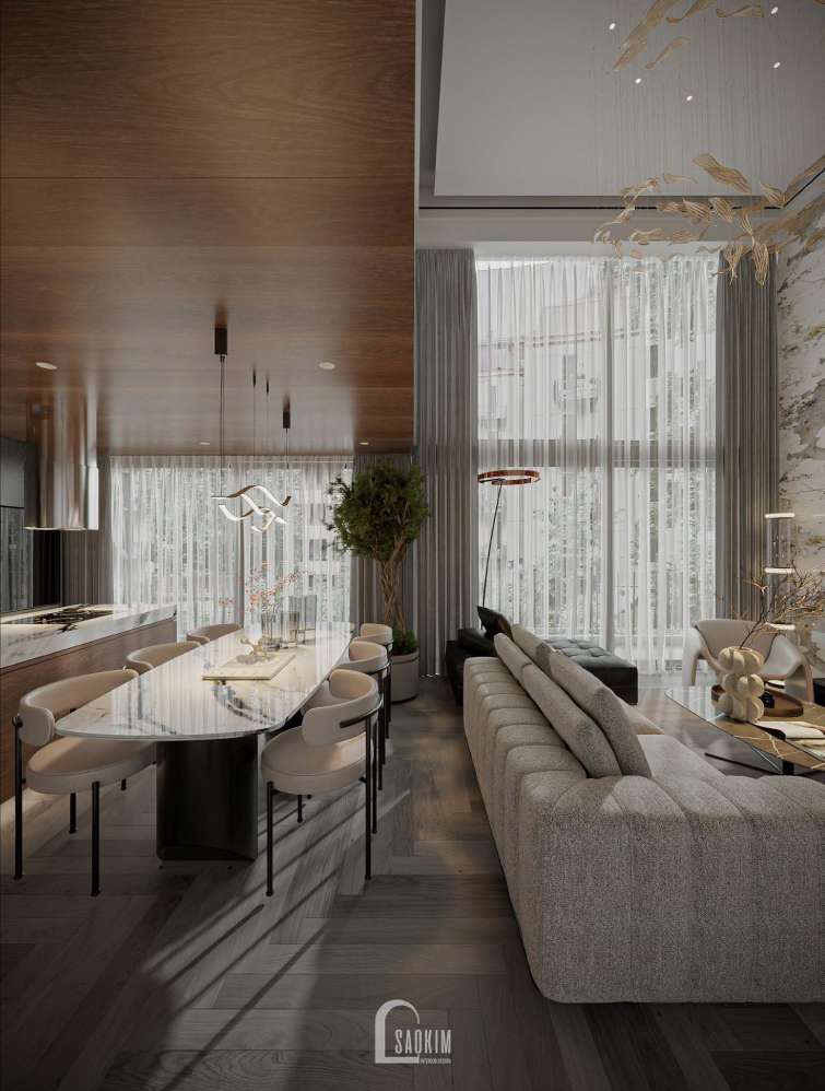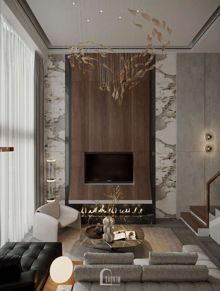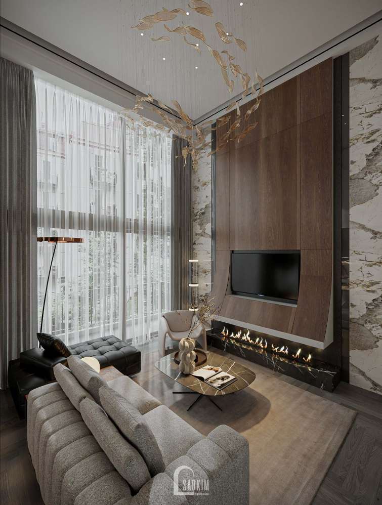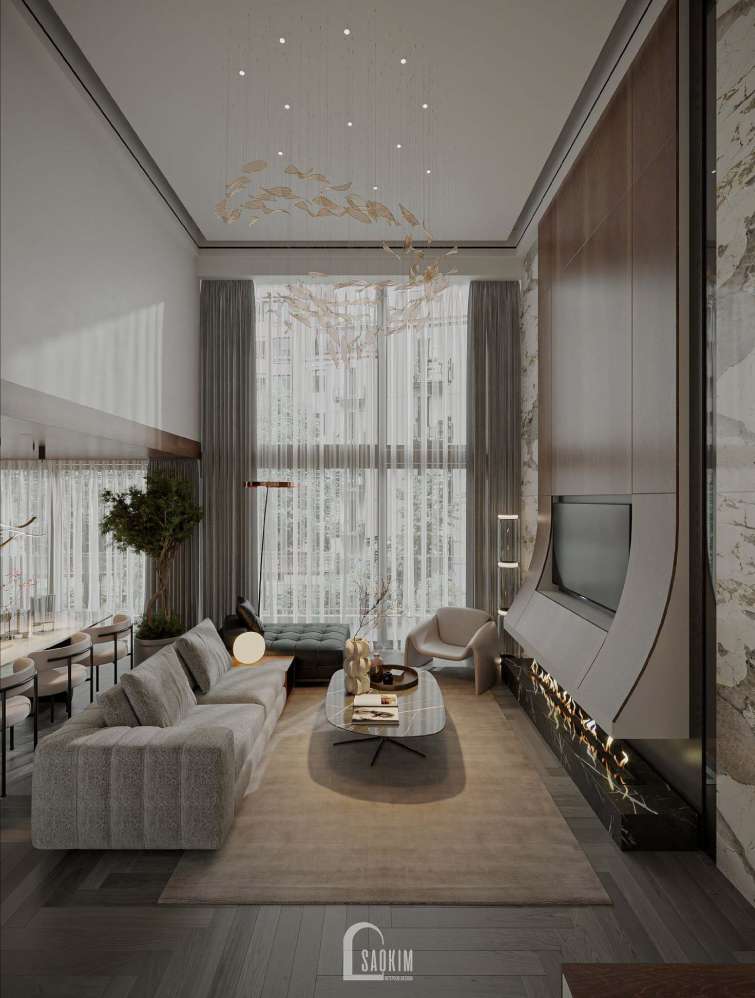 Sofa, bàn trà, và đèn trang trí thiết kế hiện đại, kết hợp cùng các vật liệu như kim loại, kính, hoặc gỗ với đường nét thẳng và sáng tạo làm nổi bật không gian đầy cá tính của gia chủ.