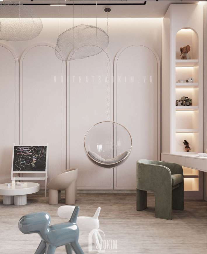 Với gam màu hồng nhẹ nhàng tạo cảm giác thích thú cho bé, cách trang trí sắp xếp đồ nội thất giúp trẻ phát triển về trí não và cơ thể. Chiếc giường ngủ lớn êm ái được bố trí ở trung tâm.