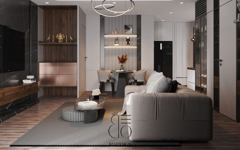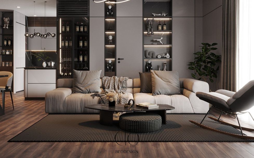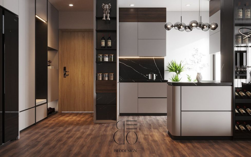 Căn hộ được bố trí khoa học, tận dụng tối đa diện tích và ánh sáng tự nhiên, kết hợp với vật liệu cao cấp và gam màu tinh tế giúp nâng tầm thẩm mỹ tổng thể.