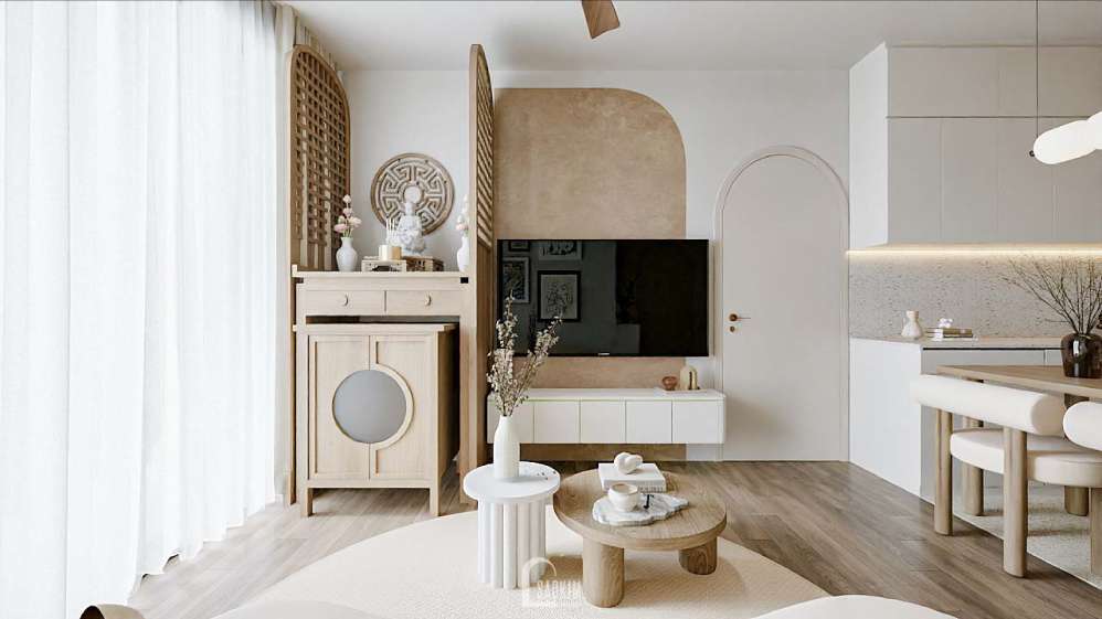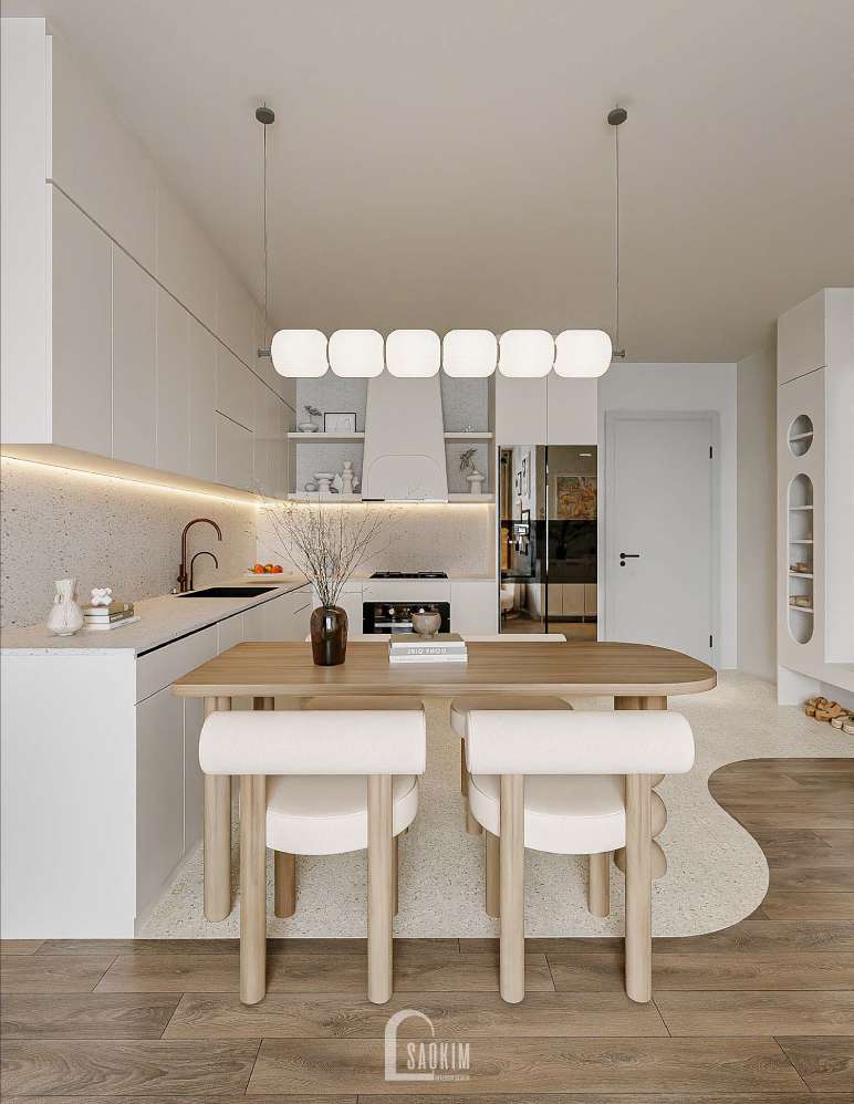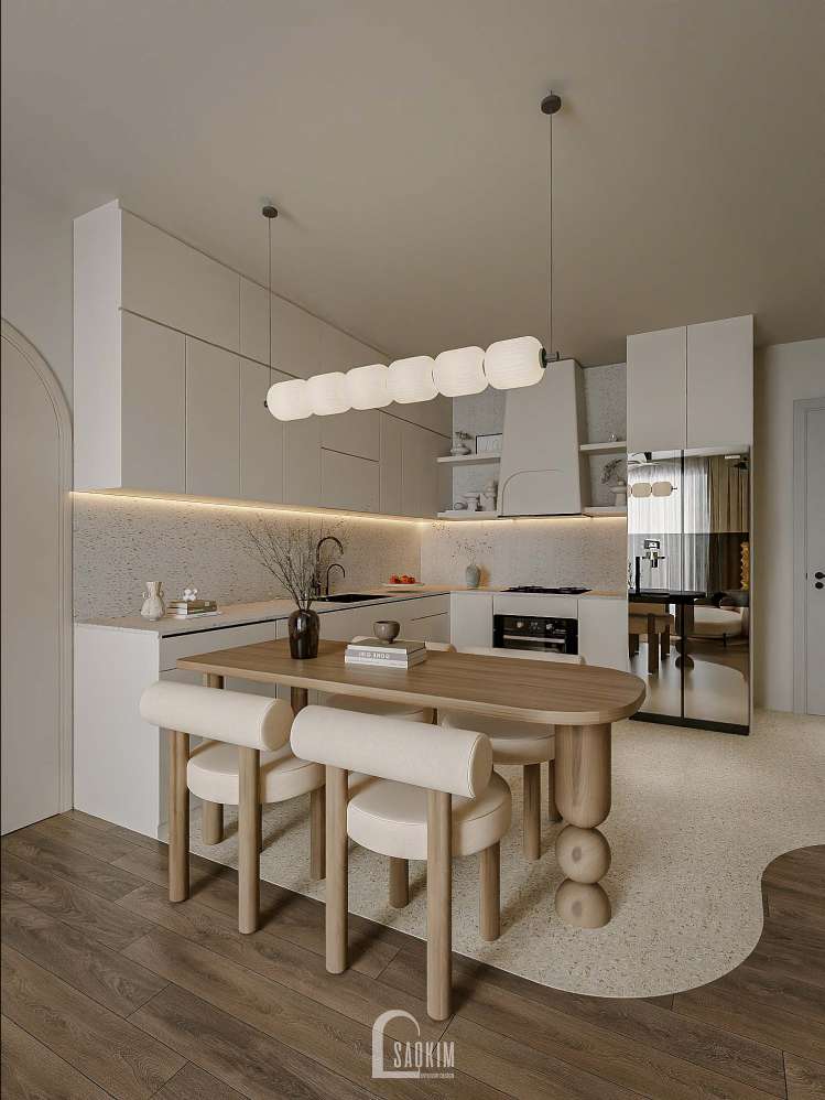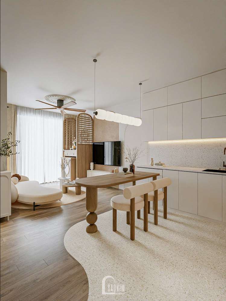 Thiết kế chung cư phong cách Korea Chic theo lối tối giản và sáng sủa tạo điều kiện tốt cho sự lưu thông giữa phòng khách và bếp giúp cho không gian mở thêm thông thoáng.