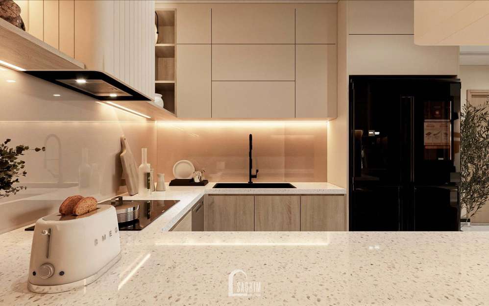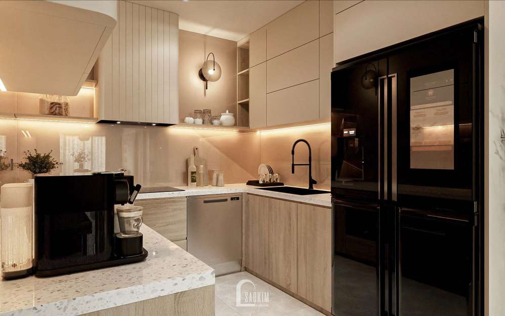 Thiết kế nội thất phòng bếp và ăn phong cách Korea Chic dự án Feliz Homes Hoàng Mai