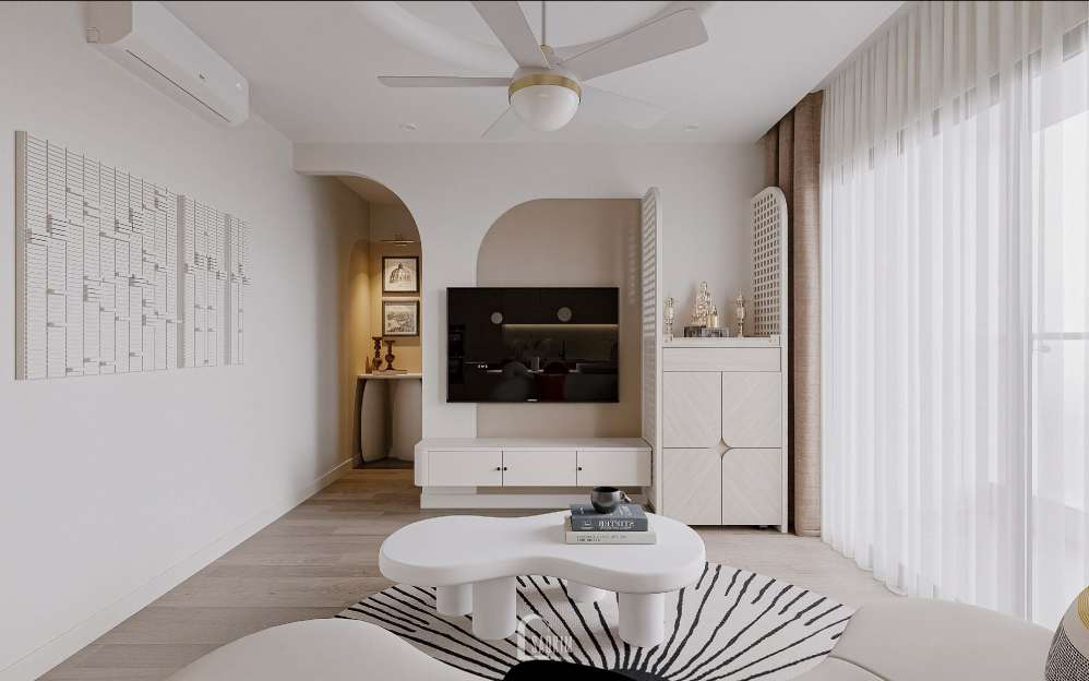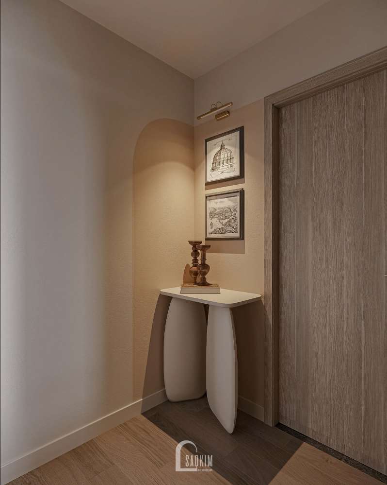 Thiết kế chung cư phong cách Wabi Sabi mix Scandinavian sử dụng màu sắc trung tính, như trắng, xám cho bức tường và trần, thêm một chút màu sắc tự nhiên bằng cách sử dụng các phụ kiện và trang trí 1 số chi tiết như nâu đậm tạo ra một không gian ấm áp, tối giản, và tôn trọng vẻ đẹp tự nhiên.