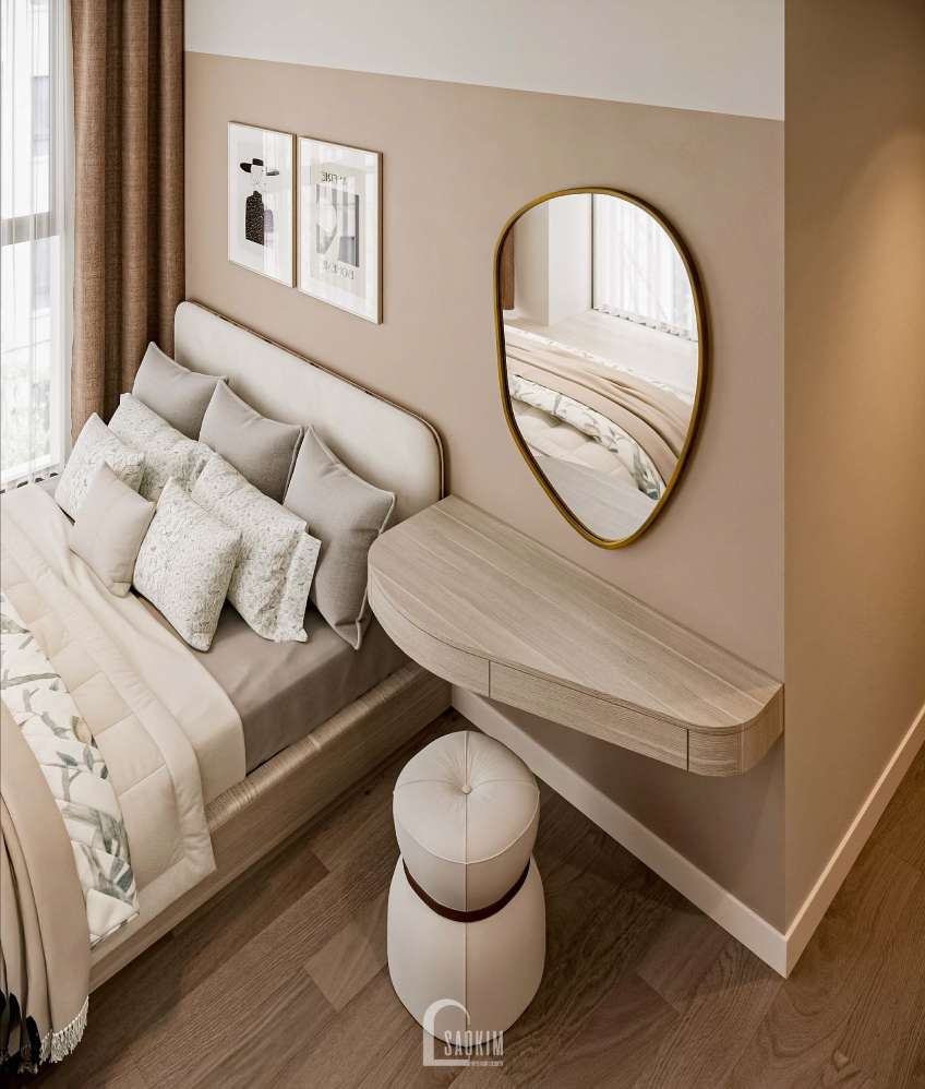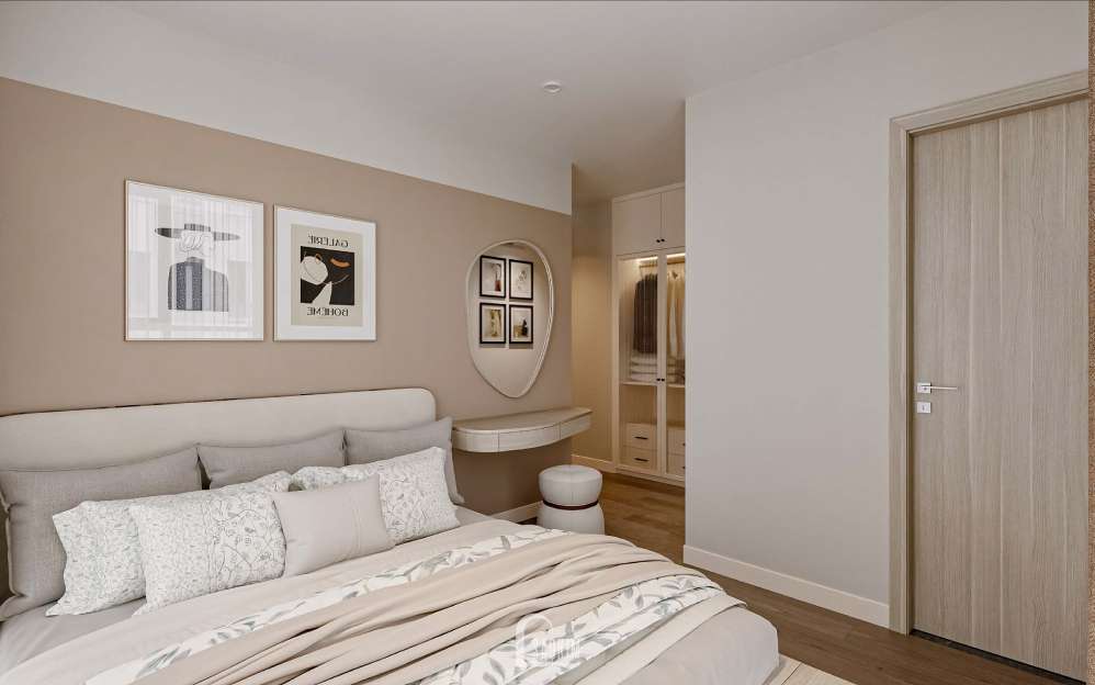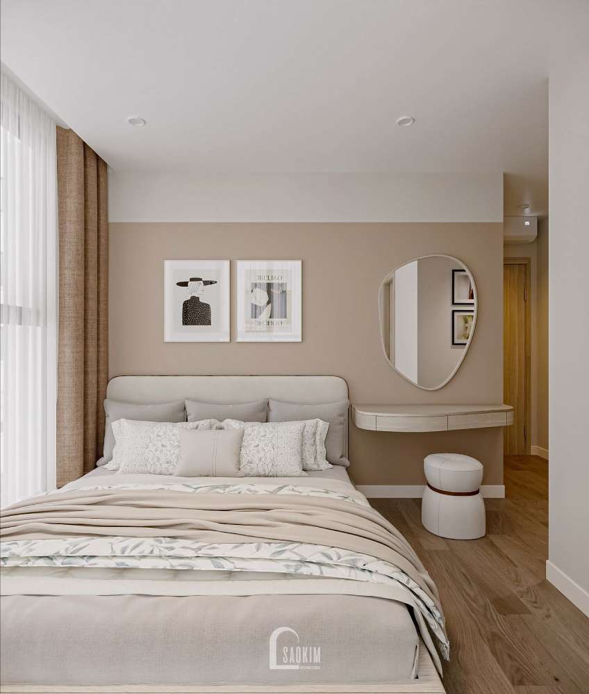 Chiếc giường với gam màu màu trung tính tạo điểm nhấn cho căn phòng.
