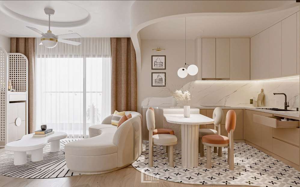 Tận dụng ánh sáng tự nhiên từ cửa ban công và rèm cửa giúp cho không gian trở nên thoáng đáng trong thiết kế nội thất chung cư đẹp không kém phần sang trọng.