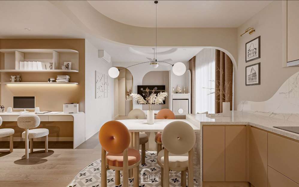 Bên cạnh thiết kế nội thất phòng bếp liền kề phòng khách, KTS còn thiết kế thêm một không gian làm việc tại đây giúp cho gia chủ có cảm giác thoải mái, không bị ngột ngạt.