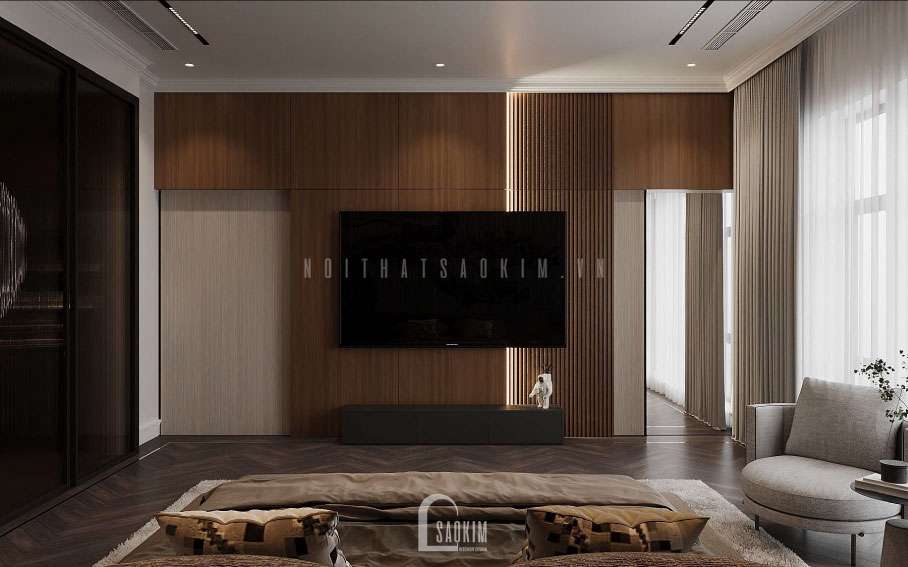 Thiết kế tivi treo tường trong phòng ngủ tiện lợi, gia chủ có thể xem phim, nghe nhạc ngay tại phòng riêng của mình mà không ảnh hưởng đến các phòng khác.