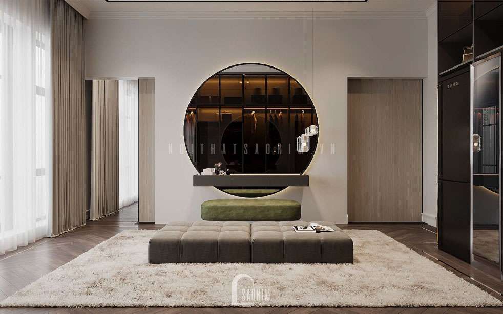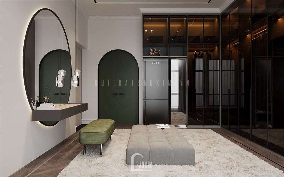 Ghế băng êm ái được bố trí cho phòng thay đồ để chủ nhân ngồi đi giày, ngồi chọn đồ. Gương lớn để soi khi trang điểm hoặc khi thử trang phục.