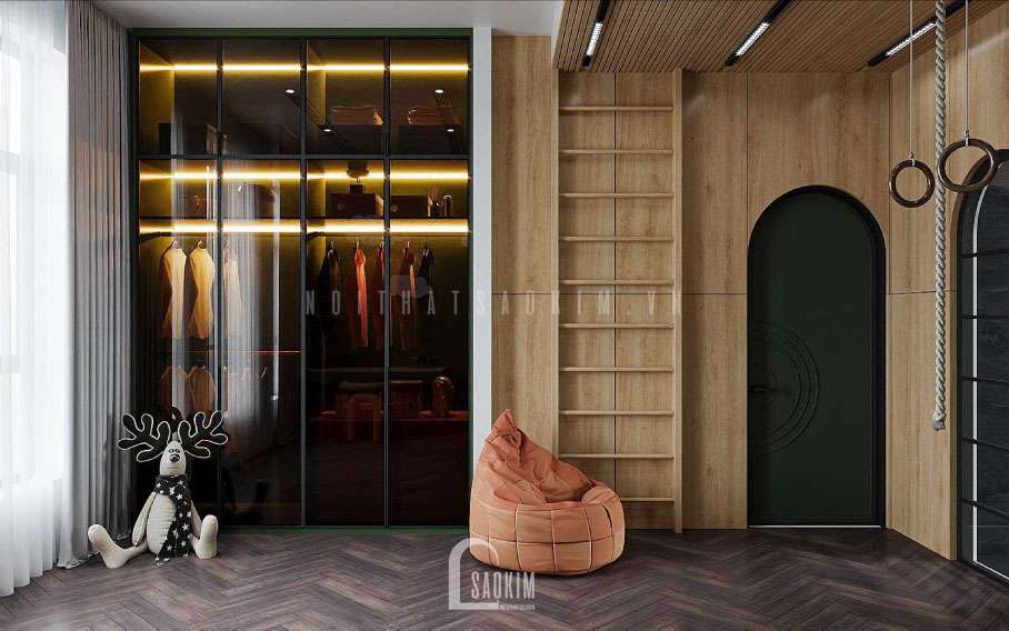 Phòng thay đồ sẽ có nhiều loại phụ kiện khác nhau như: quần áo, giày dép, túi xách,... Vì thế mà việc xếp sắp tủ đồ sao cho hơp lí đảm bảo sự lưu trữ gọn gàng là điều rất quan trọng trong thiết kế nội thất nhà liền kề 75m2.