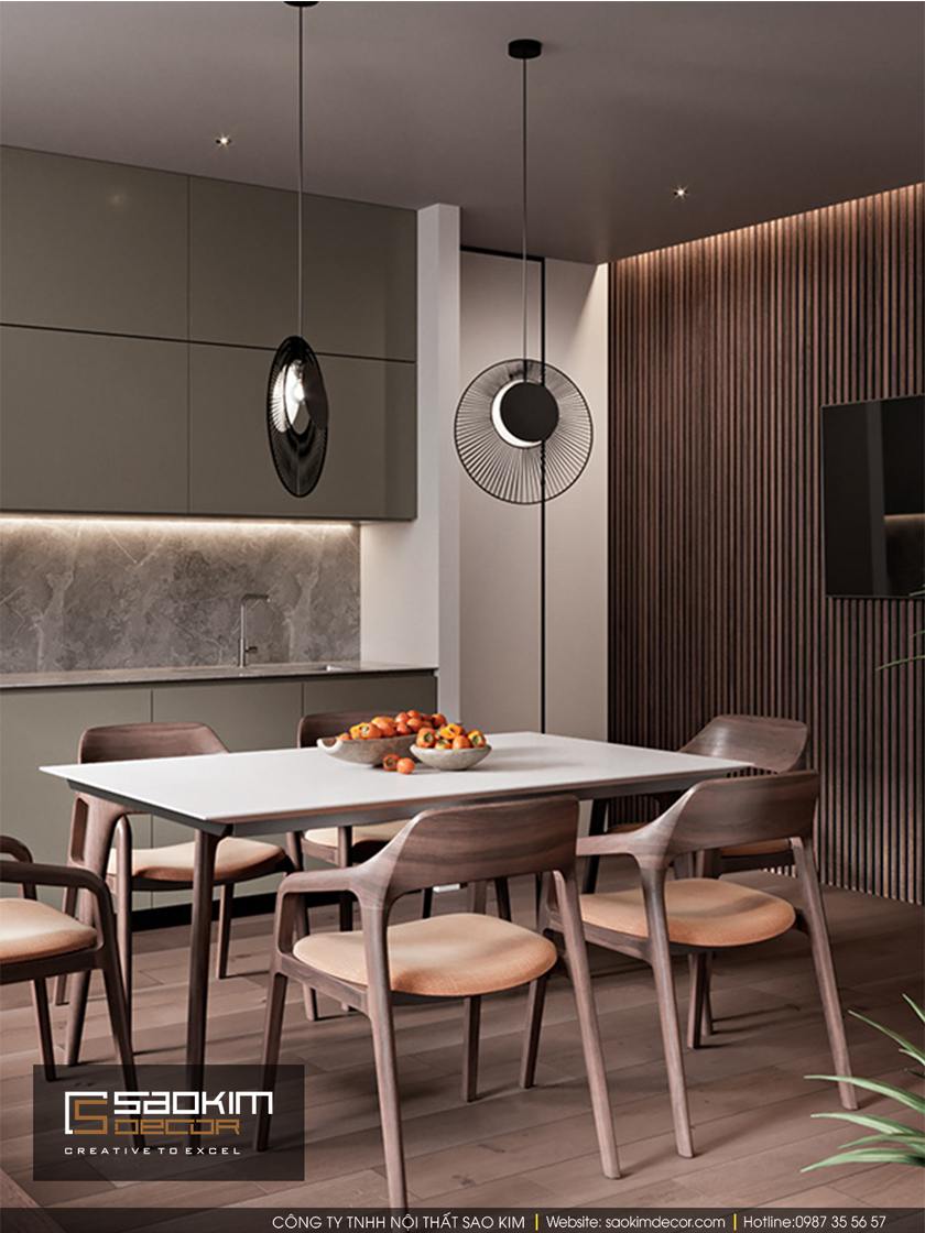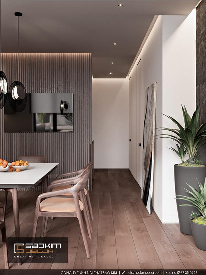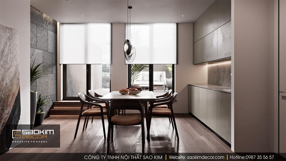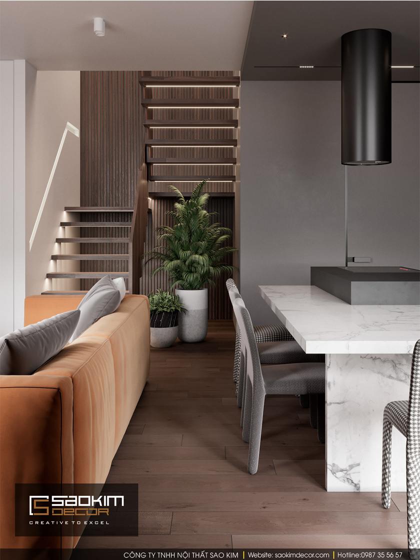 Thiết kế nội thất nhà phố theo phong cách hiện đại là lựa chọn của gia chủ căn hộ. Thiết kế nội thất là kết hợp hài hòa giữa các tone màu trắng, xám và gỗ. Qua đó mang lại mẫu thiết kế nhà ở ấm áp, sang trọng hơn bao giờ hết. Các gam màu chủ đạo được sử dụng xuyên suốt trong mỗi không gian thiết kế.
